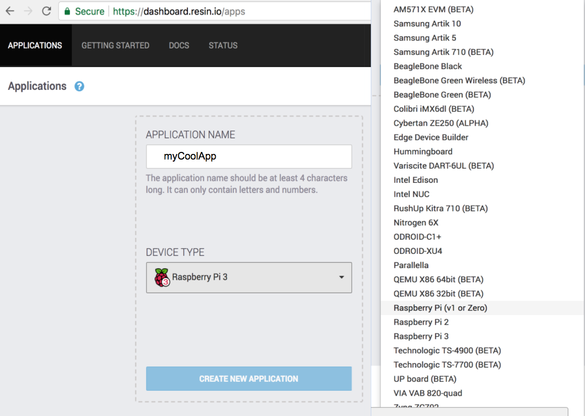 Figure 2: Create Application in Resin.io dashboard and pick device type